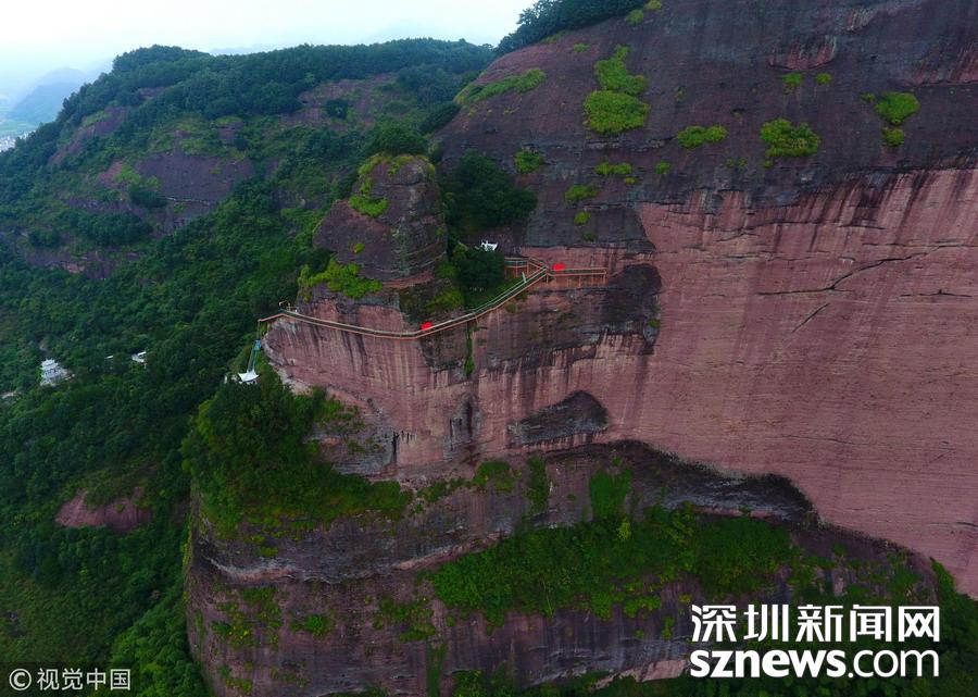 深圳新聞網(wǎng)訊 2018年6月19日,航拍江西贛州南武當山百米高空玻璃棧道。棧道緊貼峭壁,在懸崖之上凌空蜿蜒穿行,猶如一條玉龍盤旋在綠林石海之中。 南武當山位于江西最南端的龍南縣武當鎮(zhèn)境內,景區(qū)核心面積達到13.5平方公里,擁有99座千姿百態(tài)的巍峨石峰,丹霞地質風貌突出,連綿十里,被稱為“武當十里畫廊”。