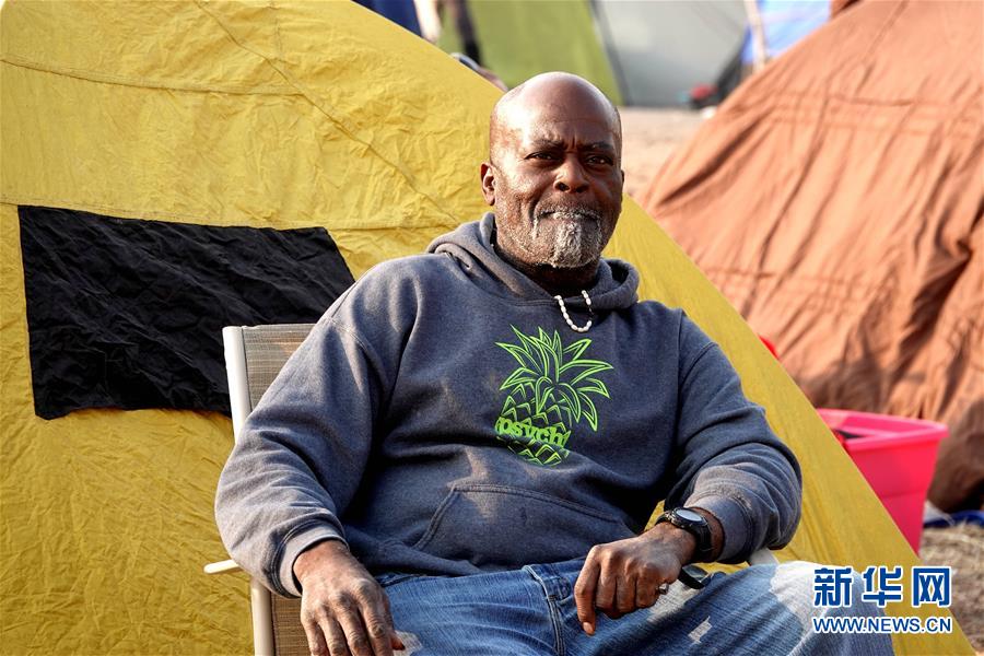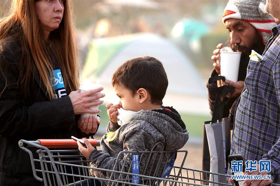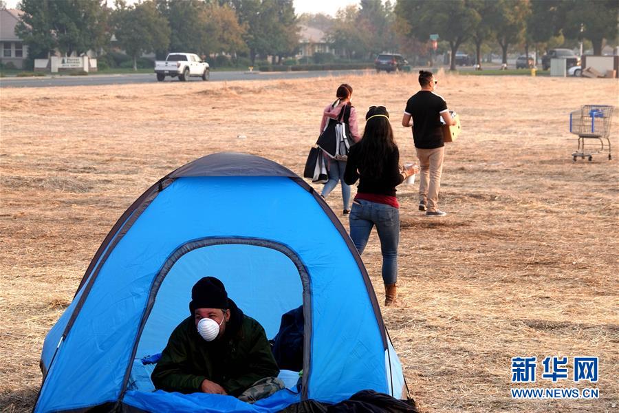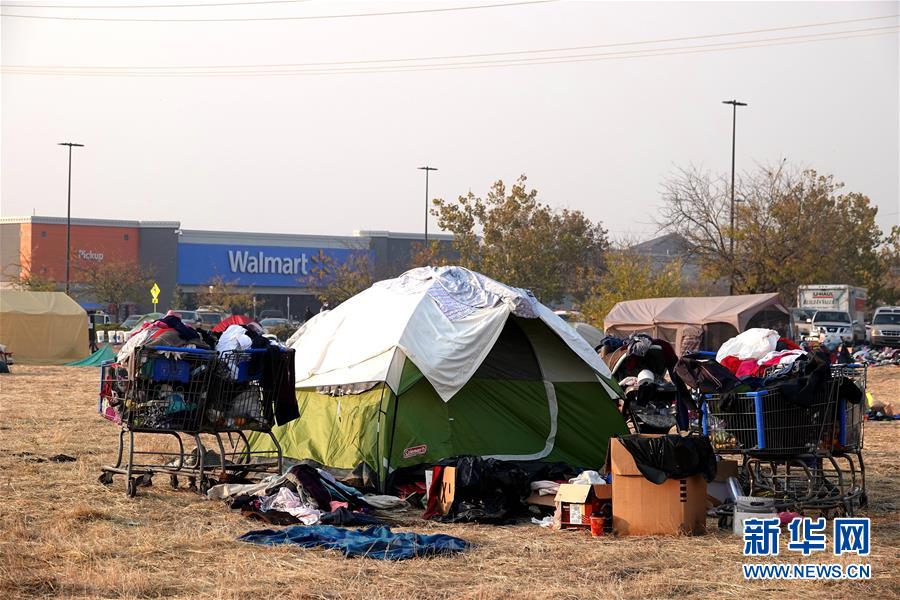 11月18日,在美國(guó)加利福尼亞州比尤特縣奇科,災(zāi)民在沃爾瑪停車場(chǎng)搭起帳篷暫居。 新華社記者吳曉凌攝