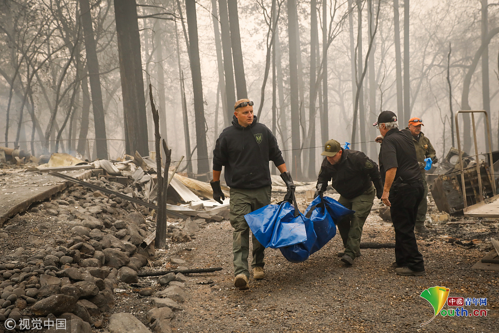 11月13日,在美國(guó)加利福尼亞州天堂鎮(zhèn),搜救人員在山火過后的廢墟工作。