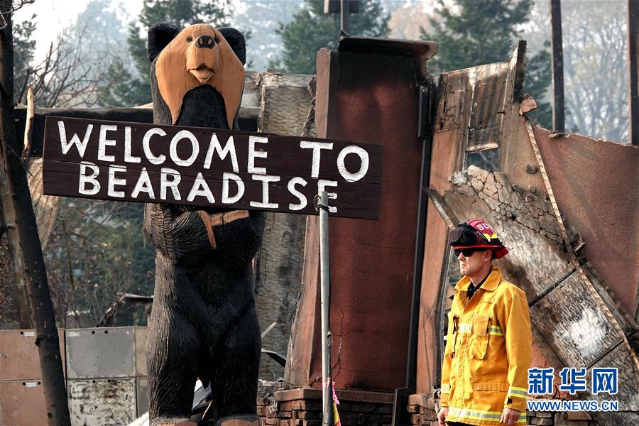 11月18日,在美國(guó)加利福尼亞州比尤特縣天堂鎮(zhèn),一名消防人員查看廢墟。 新華社記者吳曉凌攝