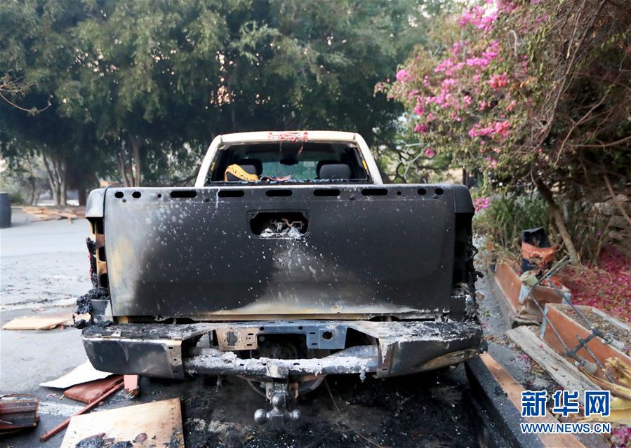 這是11月10日在美國加利福尼亞州馬里布市拍攝的一輛被燒毀的汽車。連日來,美國加利福尼亞州野火肆虐。 新華社記者李穎攝