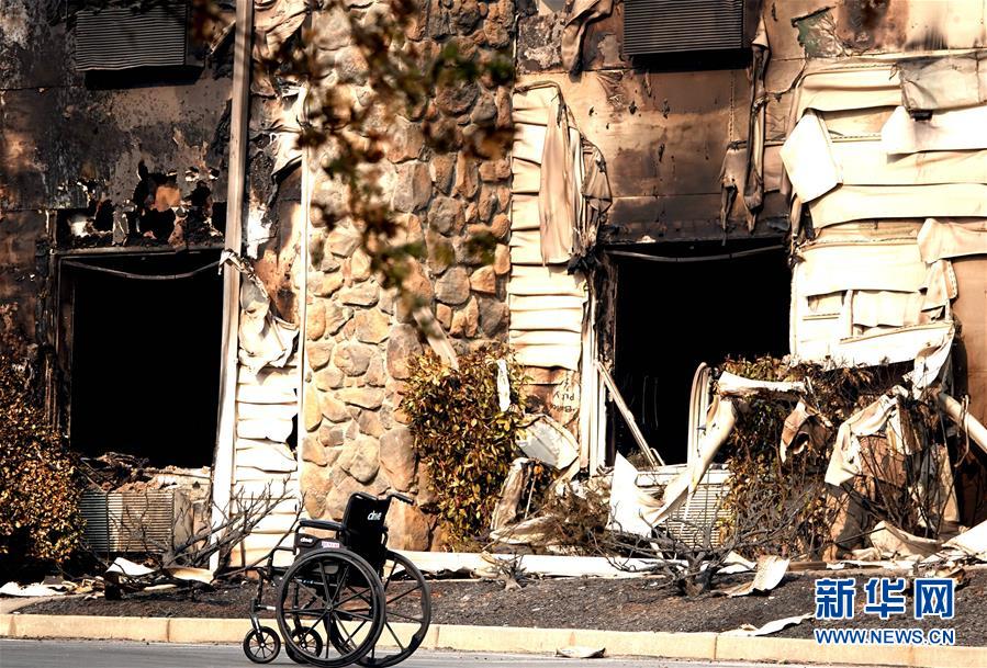 11月18日,在美國(guó)加利福尼亞州比尤特縣天堂鎮(zhèn),一個(gè)輪椅被棄置在一幢遭焚毀的住所旁。 新華社記者吳曉凌攝