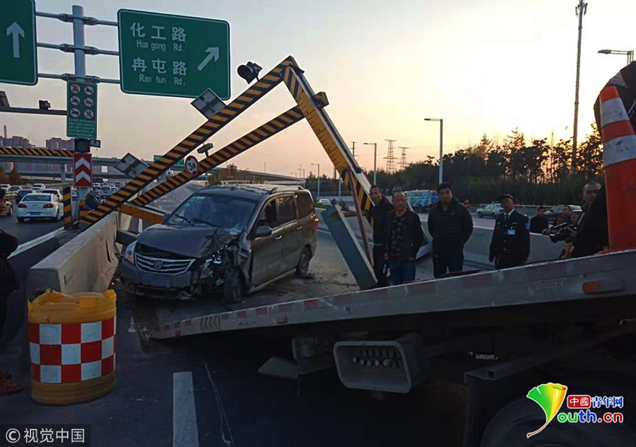 2018年11月19日下午,鄭州市西三環(huán)化工路立交橋,沿西三環(huán)由北向南方向上橋口處,一輛商務(wù)面包車失控撞塌了3米限高架,橋上交通瞬間中斷。 圖片來(lái)源:視覺(jué)中國(guó)