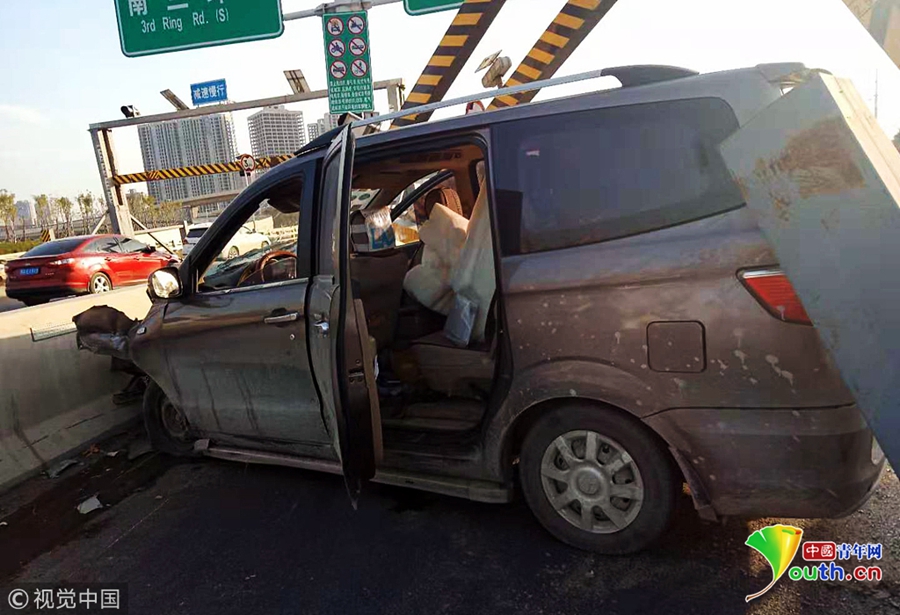 2018年11月19日下午,鄭州市西三環(huán)化工路立交橋,沿西三環(huán)由北向南方向上橋口處,一輛商務(wù)面包車(chē)失控撞塌了3米限高架,橋上交通瞬間中斷。 圖片來(lái)源:視覺(jué)中國(guó)