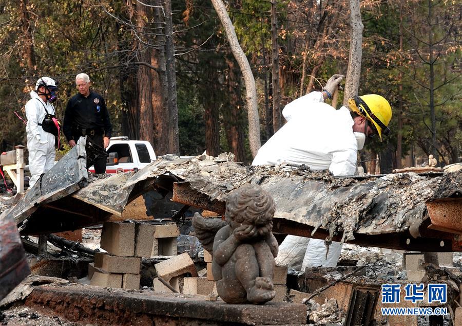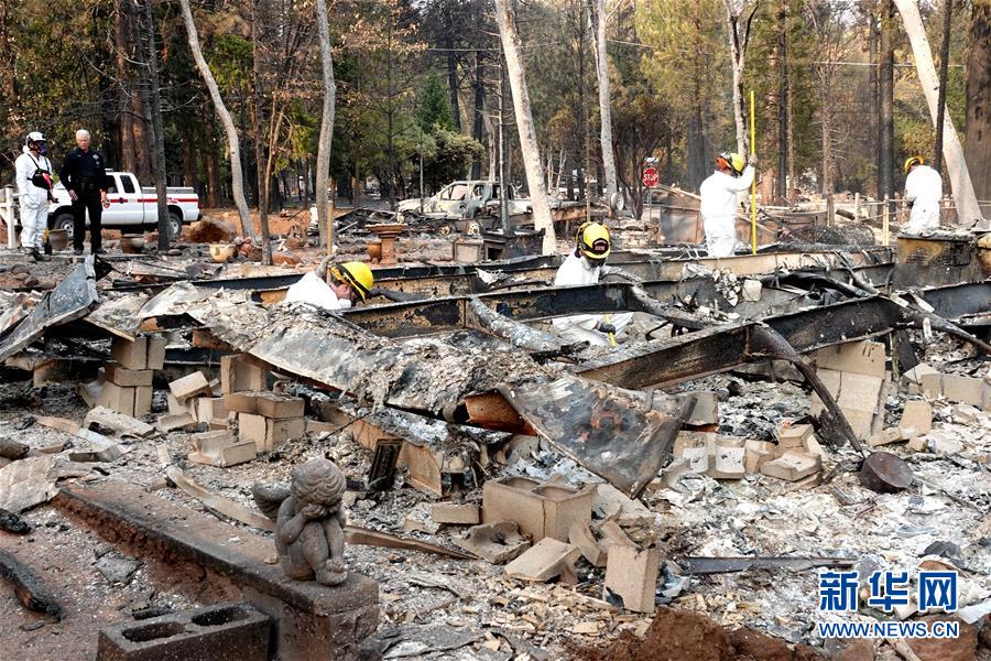 11月19日,在美國加利福尼亞州比尤特縣天堂鎮(zhèn),救援人員在山火廢墟中工作。