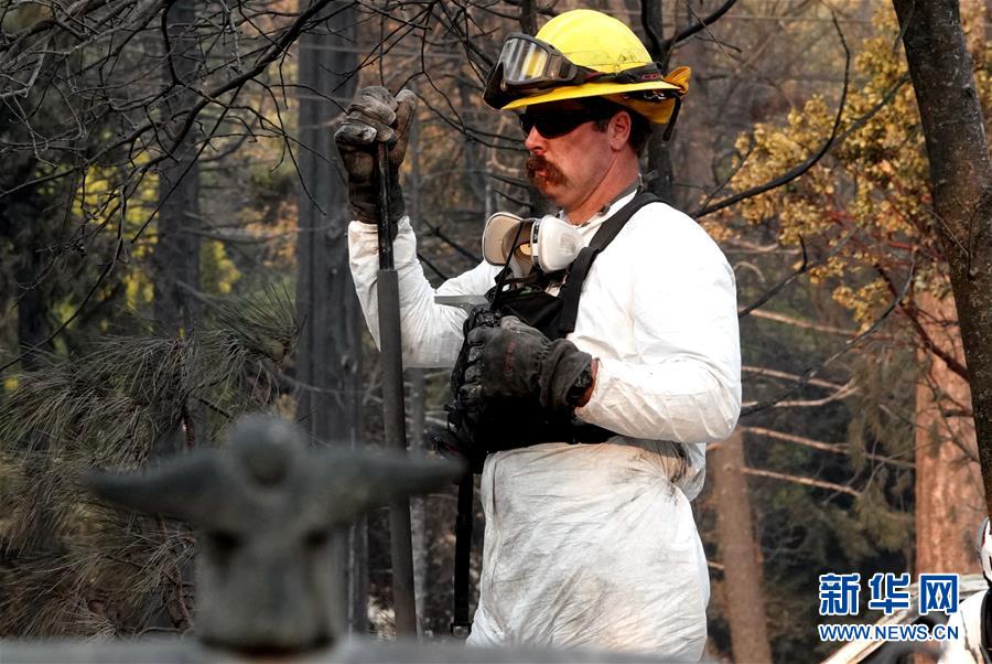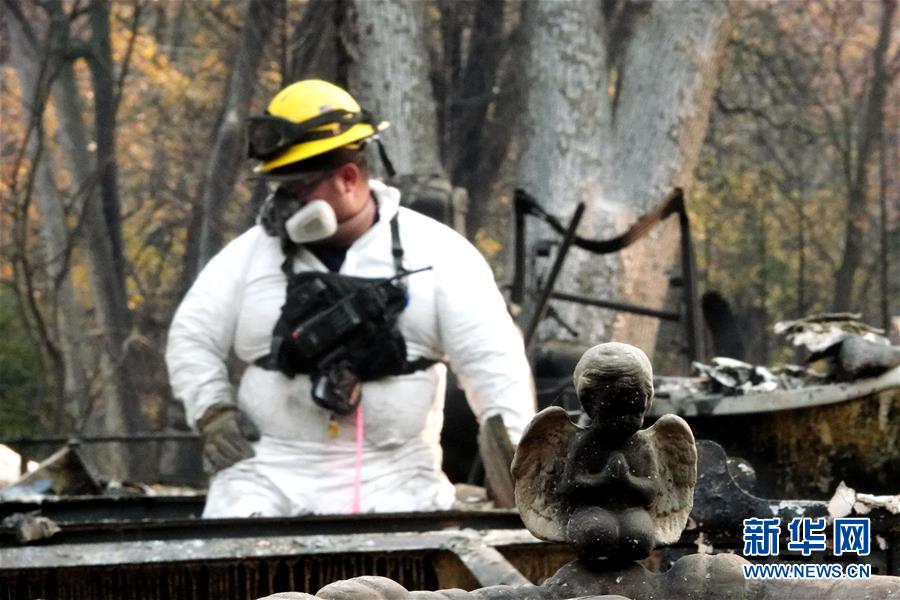 11月19日,在美國加利福尼亞州比尤特縣天堂鎮(zhèn),救援人員在山火廢墟中工作。新華社記者吳曉凌攝