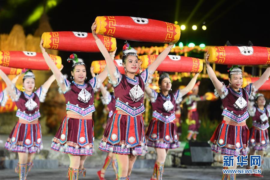 11月21日,演員表演舞蹈《天鼓神韻》。 當(dāng)日,廣西柳州市第一屆旅游產(chǎn)業(yè)發(fā)展大會(huì)暨2018第十八屆中國(guó)·融水苗族蘆笙斗馬節(jié)開(kāi)幕式晚會(huì)在融水苗族自治縣舉行。 新華社記者 周華 攝