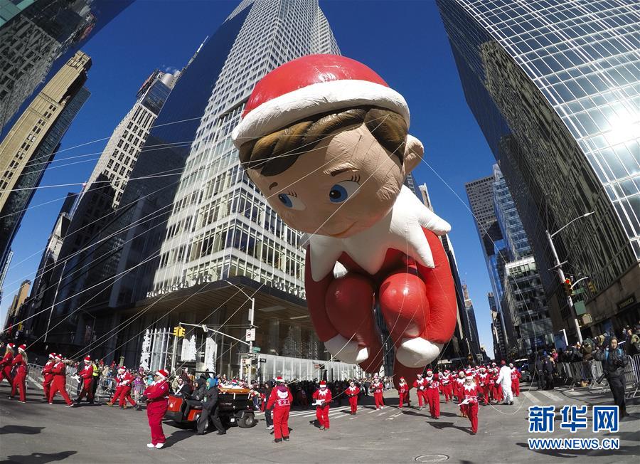 11月22日,在美國紐約感恩節(jié)大游行上,小精靈造型氣球行進(jìn)在曼哈頓街頭。