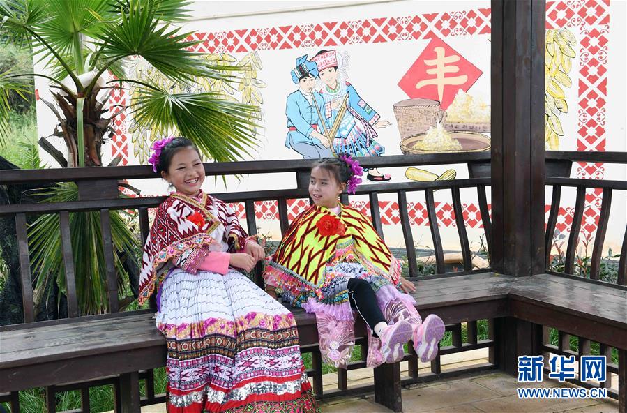 在尋甸回族彝族自治縣塘子街道小海村,兩名小女孩在村里的休閑亭玩耍(9月30日攝)。國慶節(jié)期間,云南省尋甸回族彝族自治縣塘子街道小海村一片喜慶祥和。人們身著節(jié)日盛裝,載歌載舞,歡慶搬入新居后的第一個(gè)國慶節(jié)。新華社記者楊宗友攝