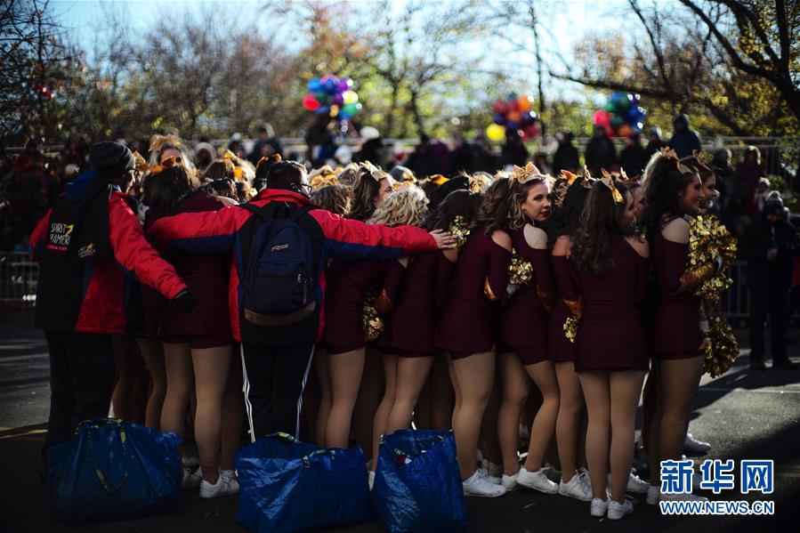 11月22日,在美國紐約感恩節(jié)大游行開始前,演員們抱團(tuán)取暖。