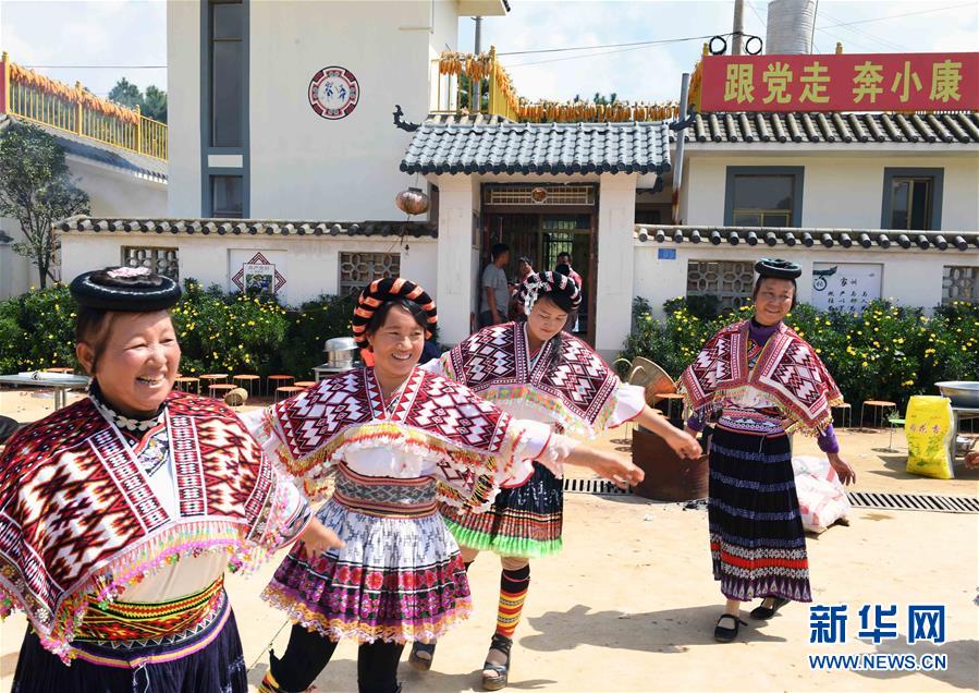 10月6日,在尋甸回族彝族自治縣塘子街道小海村,人們在村里的活動(dòng)廣場表演民間歌舞。國慶節(jié)期間,云南省尋甸回族彝族自治縣塘子街道小海村一片喜慶祥和。人們身著節(jié)日盛裝,載歌載舞,歡慶搬入新居后的第一個(gè)國慶節(jié)。新華社記者楊宗友攝