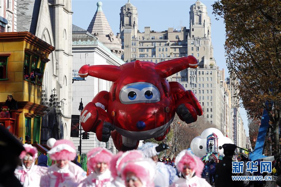 當(dāng)日,第92屆梅西感恩節(jié)大游行在紐約舉行,各式各樣的玩偶?xì)馇?、花車?duì)伍在曼哈頓的摩天大樓間穿行,吸引數(shù)百萬民眾前來觀看。梅西感恩節(jié)大游行始于1924年,是全美規(guī)模最大的感恩節(jié)游行。