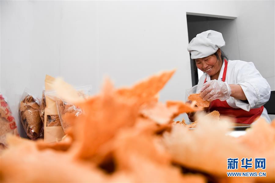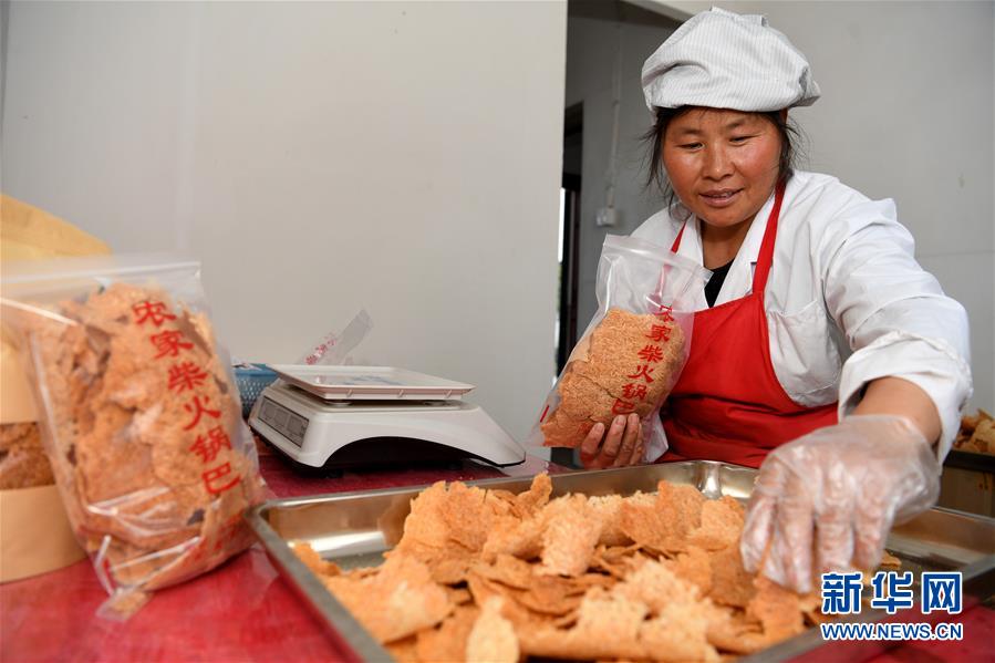 11月22日,姚新花在鍋巴廠里包裝鍋巴。新華社記者徐亮攝