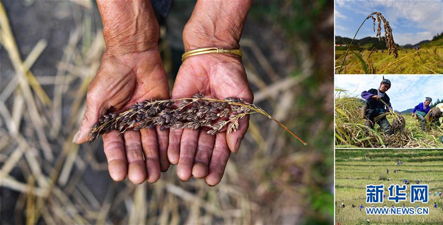 拼版照片:左圖為在安太鄉(xiāng)元寶村,80歲的賈榮專手捧剛剛收獲的香糯;右上圖為成熟待收的香糯;右中圖為賈榮專(左)在收割香糯;右下圖為村民們在收香糯(照片均攝于10月30日)。2017年,賈榮專加入村里的香糯種植合作社。香糯是廣西融水大苗山的特產(chǎn),它生長在高寒高海拔的特殊自然環(huán)境中,產(chǎn)量少,營養(yǎng)價值高。 廣西融水苗族自治縣是國家扶貧工作重點(diǎn)縣,全縣“九山半水半分田”,生活生產(chǎn)環(huán)境較為惡劣,脫貧攻堅任務(wù)艱巨,目前還有7.68萬貧困人口。面對經(jīng)濟(jì)發(fā)展落后、貧困面廣且程度深的現(xiàn)狀,當(dāng)?shù)匕衙撠毠耘c創(chuàng)新產(chǎn)業(yè)扶持相結(jié)合,依托生態(tài)資源優(yōu)勢,實(shí)施“特色產(chǎn)業(yè)富民行動”,通過發(fā)展特色民族旅游、林下經(jīng)濟(jì)和特色養(yǎng)殖業(yè)等扶貧產(chǎn)業(yè),帶動貧困群眾依靠勤勞的雙手,拔窮根摘窮帽,實(shí)現(xiàn)脫貧致富。據(jù)了解,目前全縣貧困戶參與特色產(chǎn)業(yè)發(fā)展的有2.9萬戶,扶貧產(chǎn)業(yè)覆蓋率達(dá)95%。 新華社記者 黃孝邦 攝