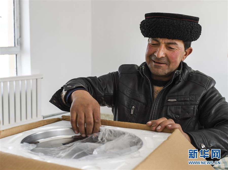 在塔什庫爾干塔吉克自治縣塔提庫力易地扶貧搬遷安置點(diǎn)的新房?jī)?nèi),都熱·加爾曼領(lǐng)取免費(fèi)發(fā)放的電飯鍋(11月18日攝)。新華社記者胡虎虎攝