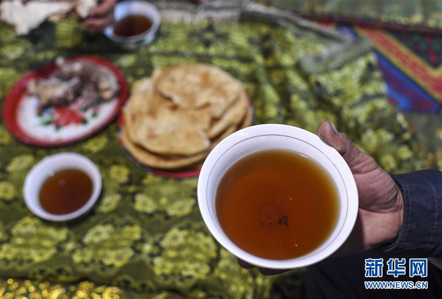 在塔什庫(kù)爾干塔吉克自治縣大同鄉(xiāng)阿克托尕欄桿村一組都熱的舊居中,都熱·加爾曼在吃早餐,準(zhǔn)備踏上搬遷之路(11月17日攝)。新華社記者胡虎虎攝