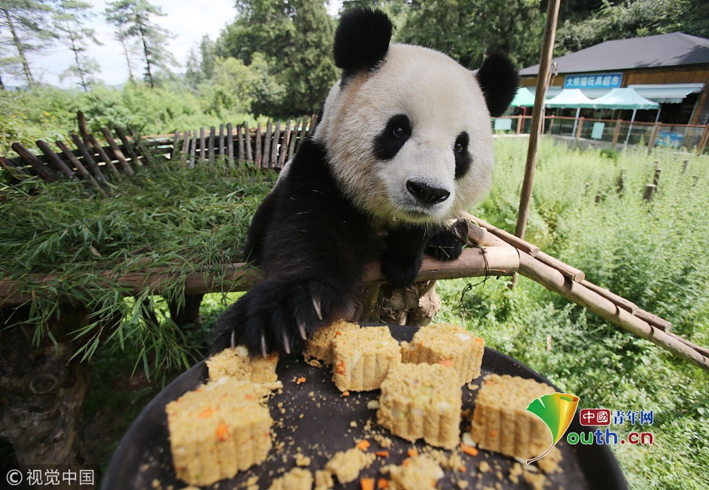 2014年9月4日,昆明,云南野生動物園,大熊貓思嘉吃專屬胡蘿卜月餅。