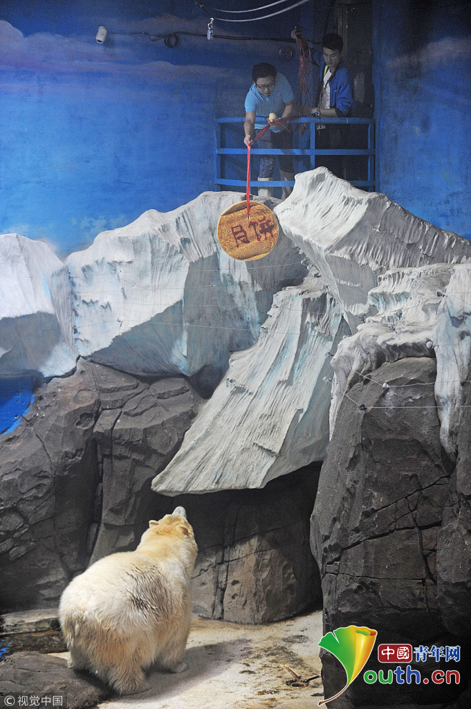 2017年9月29日,武漢海昌極地海洋公園里,北極熊“靜靜”翹首以盼為自己準(zhǔn)備的“專(zhuān)屬月餅”。