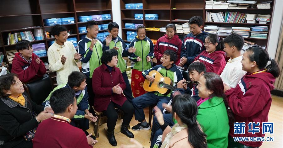 11月16日,南昌市第十七中學(xué)西藏班的學(xué)生為劉和平(中間紅衣者)及“愛(ài)心媽媽志愿服務(wù)團(tuán)”成員表演彈唱。新華社記者 胡晨歡 攝