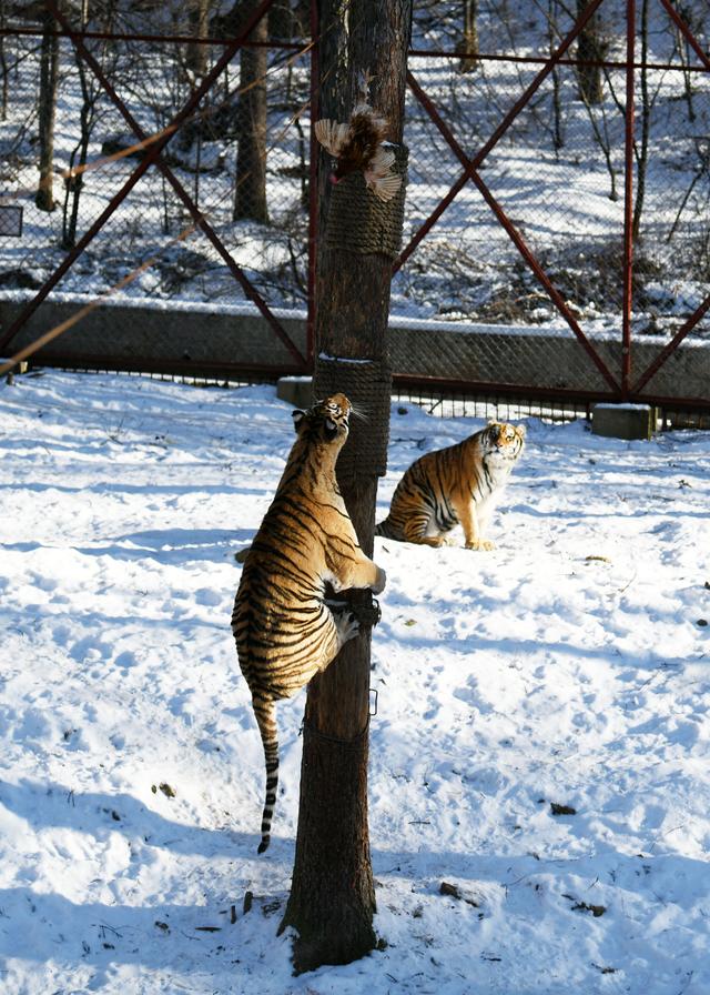 一只東北虎上樹(shù)捉雞,另一只也躍躍欲試(11月21日攝)。