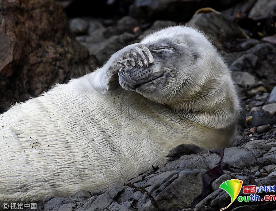 中國(guó)青年網(wǎng)北京10月9日電 當(dāng)?shù)貢r(shí)間2018年10月8日,英國(guó)彭布羅克郡,一只大西洋海豹幼崽躺在海邊礁石上。海豹幼崽出生時(shí)都有毛茸茸的白色非防水皮毛,它們會(huì)在第四周蛻皮。