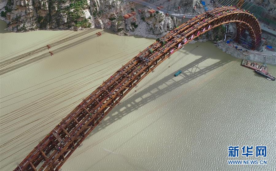 9月28日拍攝的川藏鐵路拉林段重點標志性工程藏木特大橋。 當日,隨著最后一節(jié)鋼管拱的對位和鎖定完畢,川藏鐵路拉林段藏木特大橋成功合龍,標志著大橋主體結(jié)構(gòu)施工取得了關(guān)鍵性勝利。藏木特大橋由中國中鐵廣州局集團承建,拱高112米,橋橫跨雅魯藏布江峽谷,水深66米。 新華社記者普布扎西攝