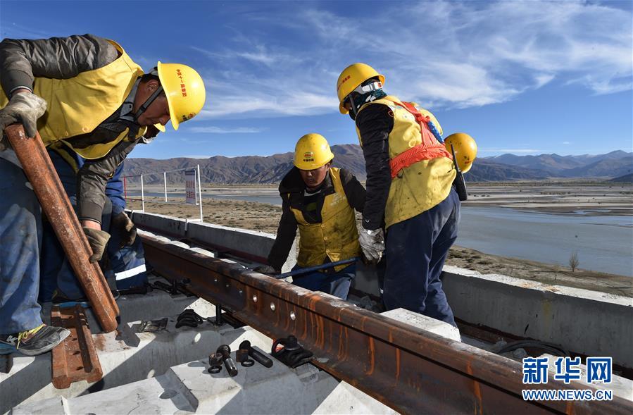 11月26日,施工人員在川藏鐵路拉林段貢嘎雅魯藏布江特大橋上鋪軌。 新華社記者 覺果 攝