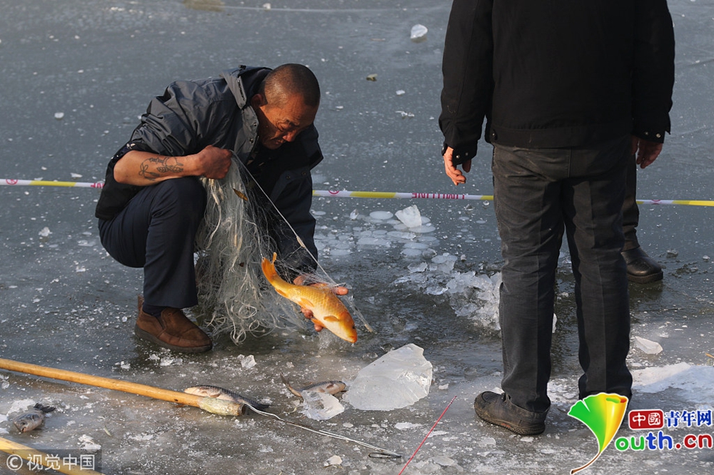 2018年11月25日,黑龍江省哈爾濱市,松花江封江不久,已經(jīng)有人蹬江鑿冰下網(wǎng)捕魚。 圖片來源:視覺中國