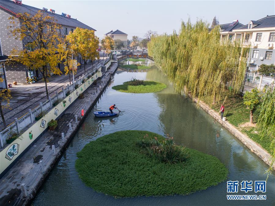 11月28日,長興縣虹星橋鎮(zhèn)港口村東港內(nèi),河長孫根法在打撈水面漂浮物(無人機拍攝)。東港全長1500米,環(huán)繞港口新村。2012年,新村建成后,港口村通過加固河岸、清理河道、種植浮草等方式對東港進行生態(tài)治理,并由該村黨總支書記孫根法擔任河長,定期開展巡查,引導村民自覺維護河道整潔。 新華社記者 徐昱 攝