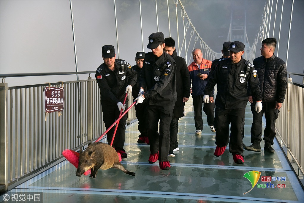 2018年11月29日,一只山豬誤入廣東清遠(yuǎn)古龍峽云天玻霸玻璃橋,結(jié)果被嚇得趴在橋面上發(fā)抖,幾名值班保安齊心協(xié)力將山豬從玻璃橋上解救出來(lái),將其送回森林。