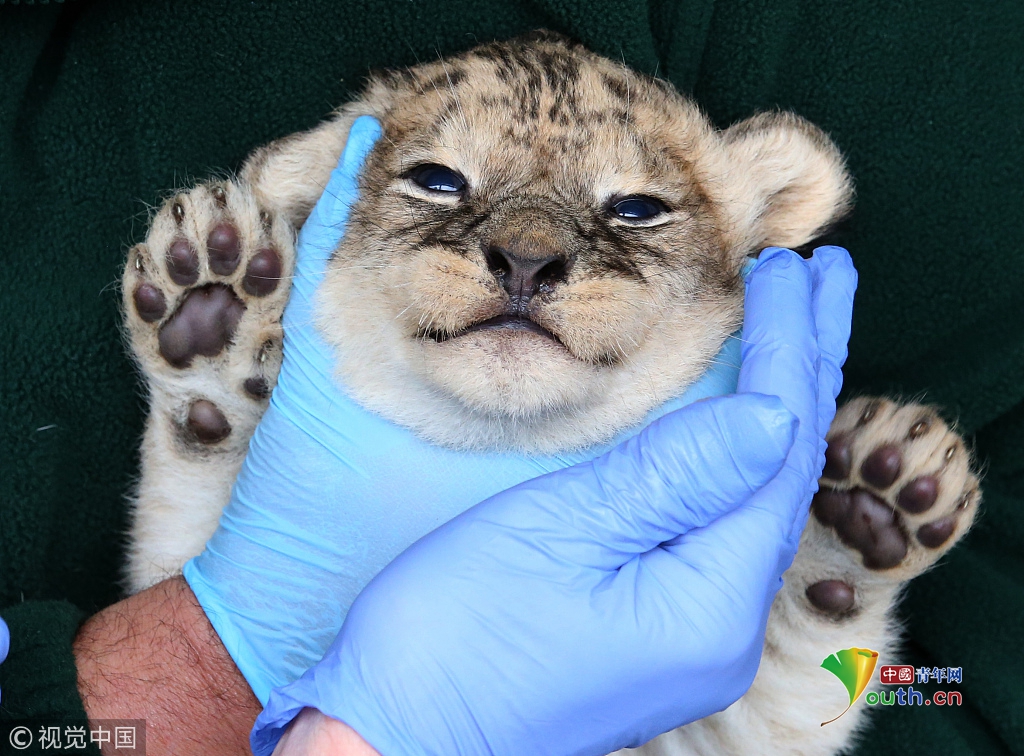 《我快要窒息了。?!?016年7月28日訊,英國斯特靈,布萊爾德拉蒙德野生動物園四只三周大的幼獅接受首次健康檢查。