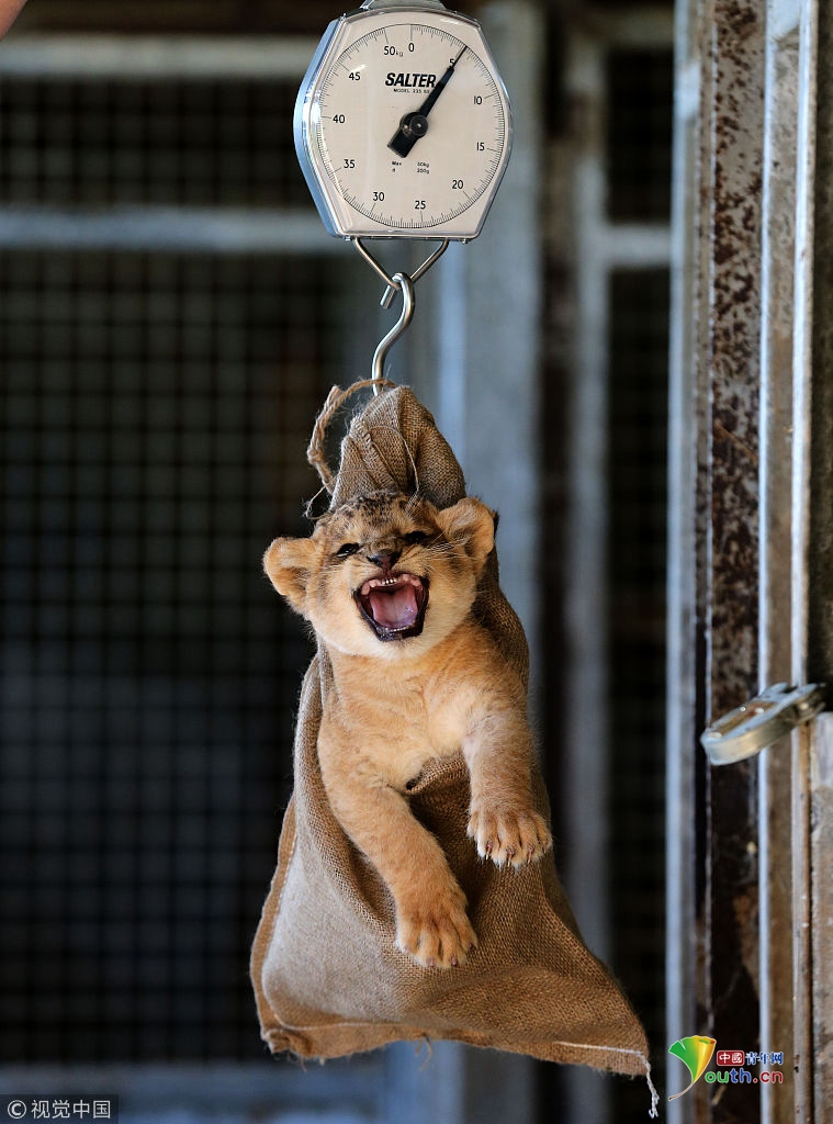 當(dāng)?shù)貢r(shí)間2013年10月10日,英國(guó)蘇格蘭斯特靈,Blair Drummond Safari野生動(dòng)物園一頭新生獅子幼崽進(jìn)行稱重。它僅有一個(gè)月大。