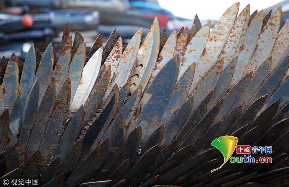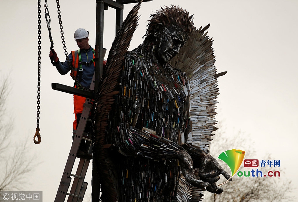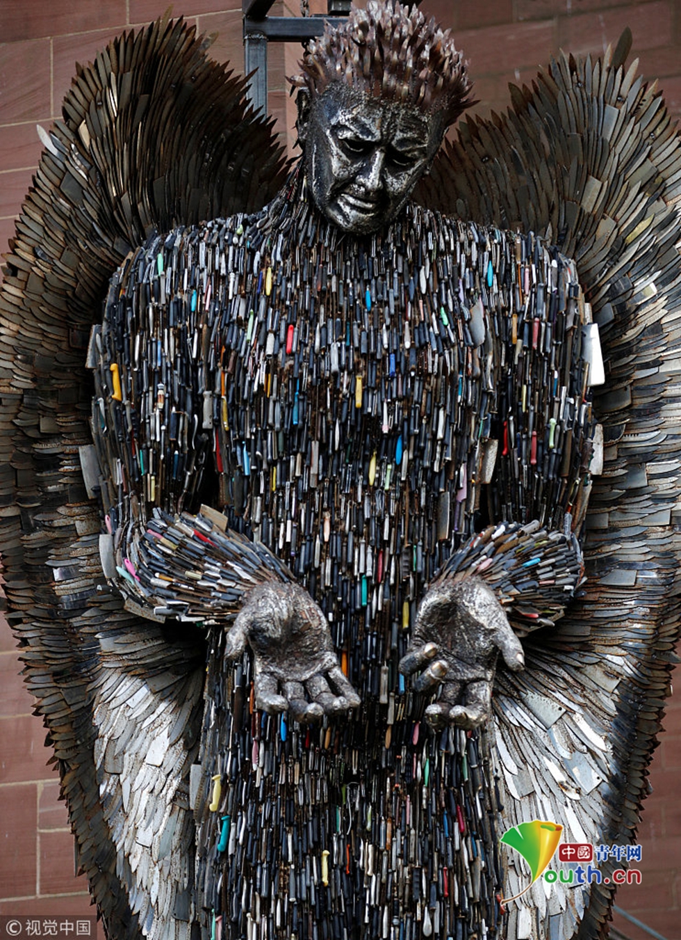 當(dāng)?shù)貢r間2018年11月29日,英國利物浦,藝術(shù)家阿爾菲·布拉德利在圣公會教堂外用沒收的10萬多把刀具制作了一尊名為“刀之天使”的塑像。