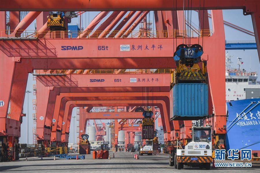 11月29日,在福建省石獅市蚶江鎮(zhèn)石湖港區(qū),泉州太平洋碼頭公司的大型機(jī)械在為一艘貨輪裝貨。 新華社記者 宋為偉 攝