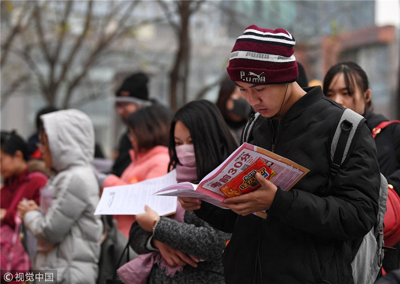 2018年12月2日,北京,參加2019年度中央機關(guān)及其直屬機構(gòu)公務(wù)員招考筆試的考生走入首都經(jīng)濟貿(mào)易大學(xué)考點準(zhǔn)備考試,步履匆匆。2019年度中央機關(guān)及其直屬機構(gòu)公務(wù)員招考筆試今日開考。本次國考計劃招錄1.45萬人,共有137.93萬人通過報名資格審查,平均競爭比達到95:1,為近5年來最高,最熱崗位的競爭超過4000:1。視覺中國