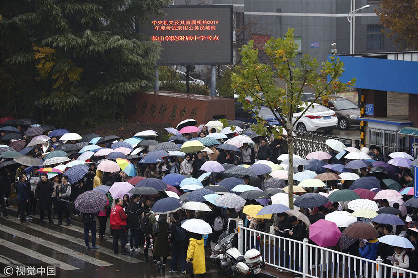2018年12月2日9時,山東泰安,2019年度國考公共科目筆試開考。雨中趕考的考生,成為一道靚麗的風(fēng)景線。無/視覺中國