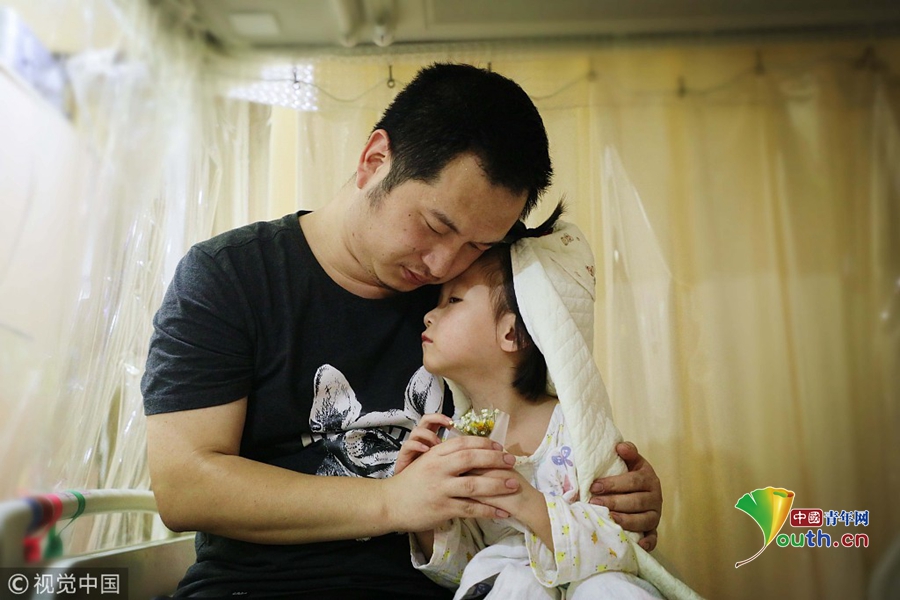 中國青年網(wǎng)北京12月3日電2018年11月17日,在北京博仁醫(yī)院病房內(nèi),4歲的小婭馨披著一條象征著婚紗的毯子坐在床上,爸爸袁東方雙手捧著一束小小的假鮮花單膝跪地向女兒“求婚”,隨后,父女倆緊緊地擁抱在一起,顯得既幸福又傷感。旁邊的小婭馨媽媽抹著眼淚抽泣著說“我女兒未必明白結婚寓意著什么,但她真的好想健康地活著!她是那么天真無邪,又那么懂事可愛,我們真舍不得丟下她不管,祈求社會上的好心人幫幫我們,救救我心愛的女兒吧!”。