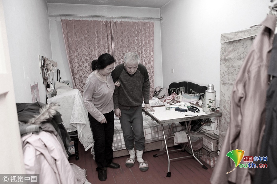 2018年11月22日,遼寧丹東,在出租屋內(nèi),袁東方的母親正在攙扶著老伴兒鍛煉身體。魏建順/視覺中國