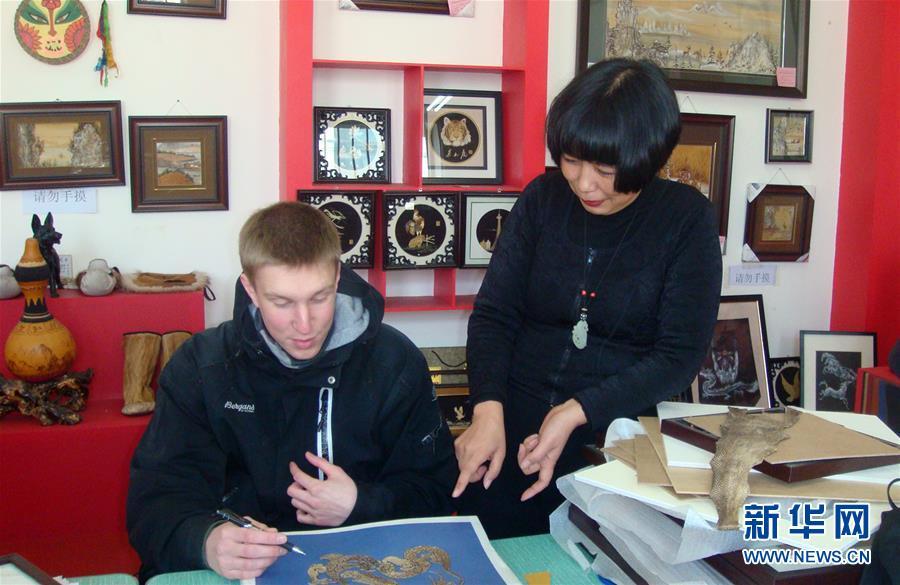張琳在位于哈爾濱的工作室指導(dǎo)前來參觀學(xué)習(xí)的外國學(xué)生制作魚皮畫(2011年3月20日攝)。國家級非物質(zhì)文化遺產(chǎn)赫哲族魚皮制作技藝是我國赫哲族傳統(tǒng)手工藝術(shù)。作為這項(xiàng)技藝的黑龍江省級傳承人,十余年來,張琳一直從事魚皮畫的研究和創(chuàng)作,并通過做推廣、開講座、辦活動(dòng),讓更多年輕人了解并喜歡上這一傳統(tǒng)手工藝,將這項(xiàng)瀕臨失傳的藝術(shù)更好地傳承下去。新華社發(fā)