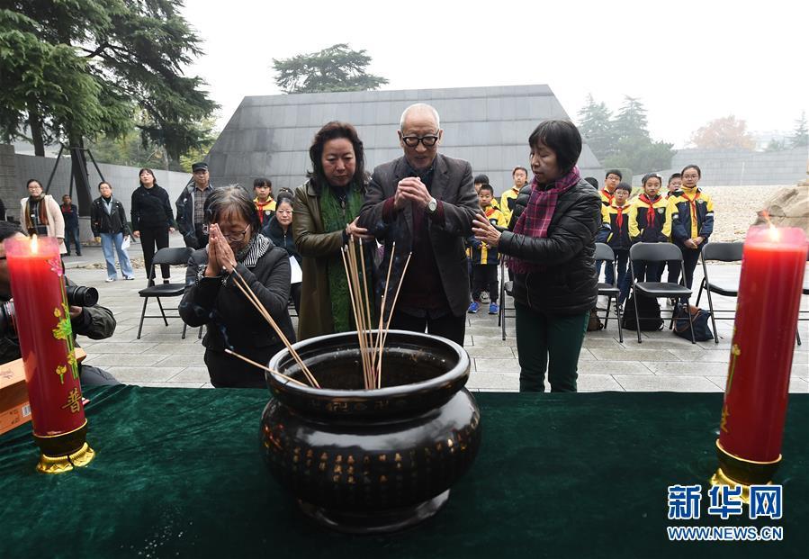 12月3日,南京大屠殺幸存者余昌祥(前排右二)率家屬祭拜被侵華日軍殺害的親人。 當(dāng)日,在第五個南京大屠殺死難者國家公祭日到來之際,南京大屠殺死難者遺屬家祭活動在侵華日軍南京大屠殺遇難同胞紀(jì)念館正式啟動。首批前來開展家祭活動的南京大屠殺幸存者余昌祥、石秀英老人分別率家屬在紀(jì)念館內(nèi)的死難者名單墻前獻(xiàn)花、敬香、跪拜,并誦讀家信,表達(dá)對親人的哀思。 新華社記者 孫參 攝