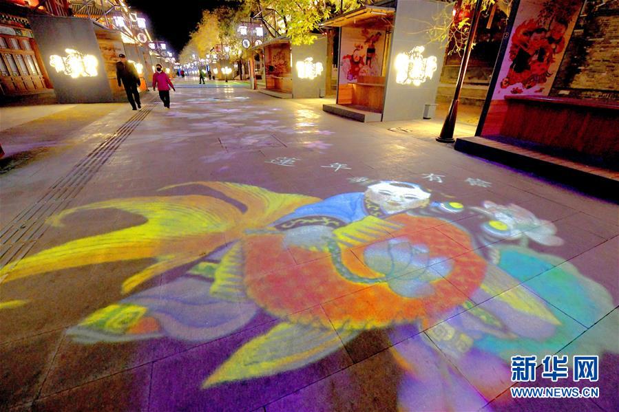 12月4日,楊柳青年畫主題燈光布滿古鎮(zhèn)步行街。 近日,天津市西青區(qū)楊柳青古鎮(zhèn)在步行街新增9組以楊柳青年畫代表作為主題的動(dòng)態(tài)夜景燈光,講述古鎮(zhèn)與年畫的歷史。 新華社記者 岳月偉 攝