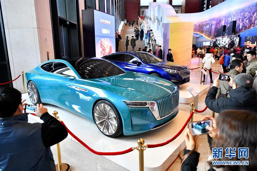 12月4日,觀眾在“偉大的變革——慶祝改革開放40周年大型展覽”上參觀紅旗“E·境”概念車(左)。 新華社記者 李鑫 攝
