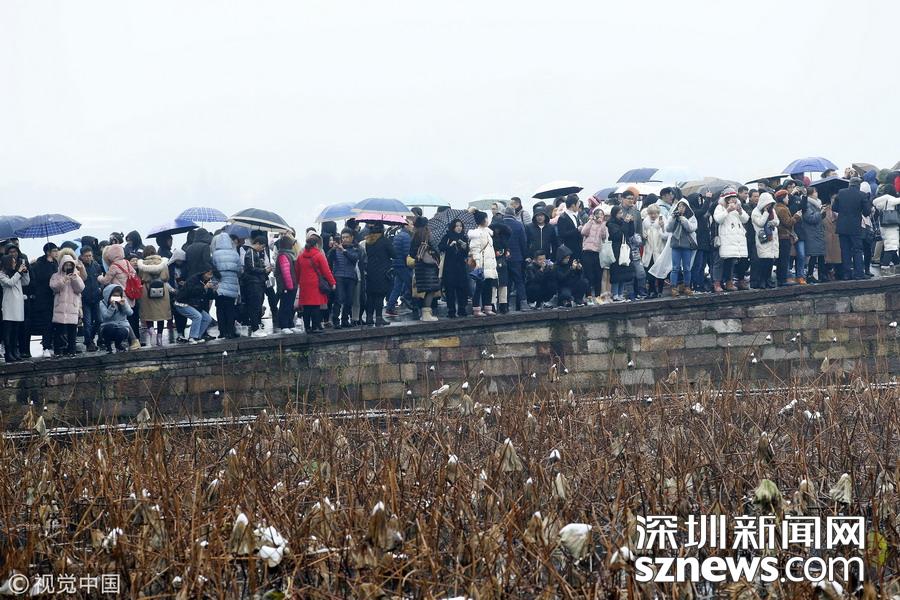 深圳新聞網(wǎng)訊 2018年12月8日,杭州,當(dāng)日市區(qū)普降大雪,市民和游客扎堆涌入西湖景區(qū),拍攝最美雪景照片以及為自己留影。每次杭州一下雪,斷橋便成為眾多游客欣賞雪景、拍攝雪景的地方,大家都想看看“斷橋殘雪”。游客們?cè)延咳霐鄻蚝螅松饺撕?,讓現(xiàn)場堪比春運(yùn)場景。因?yàn)槿颂?,雪積不起來,斷橋看不到殘雪。