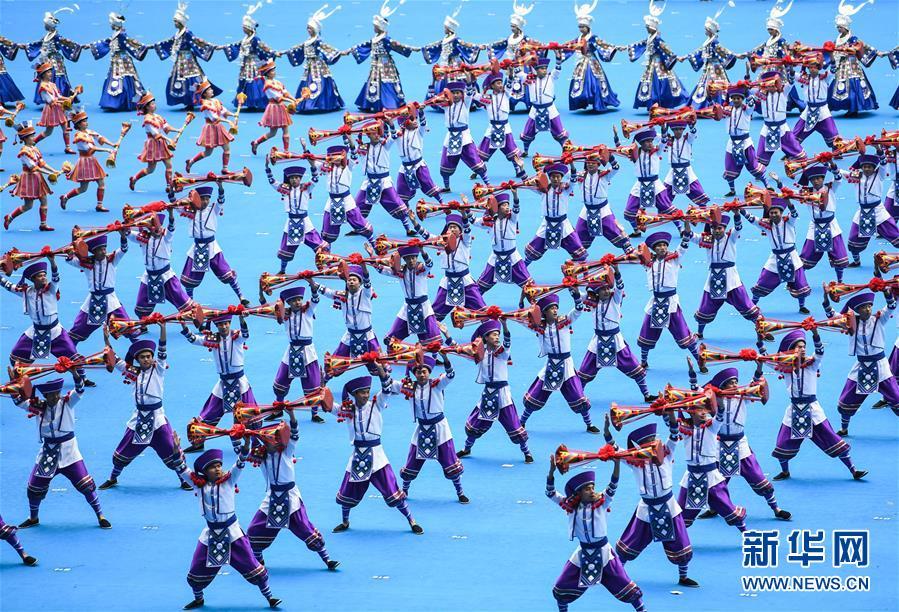 12月10日,廣西壯族自治區(qū)成立60周年慶祝大會在廣西體育中心隆重舉行。這是慶祝大會上的群眾文藝表演。 新華社記者 李鑫 攝