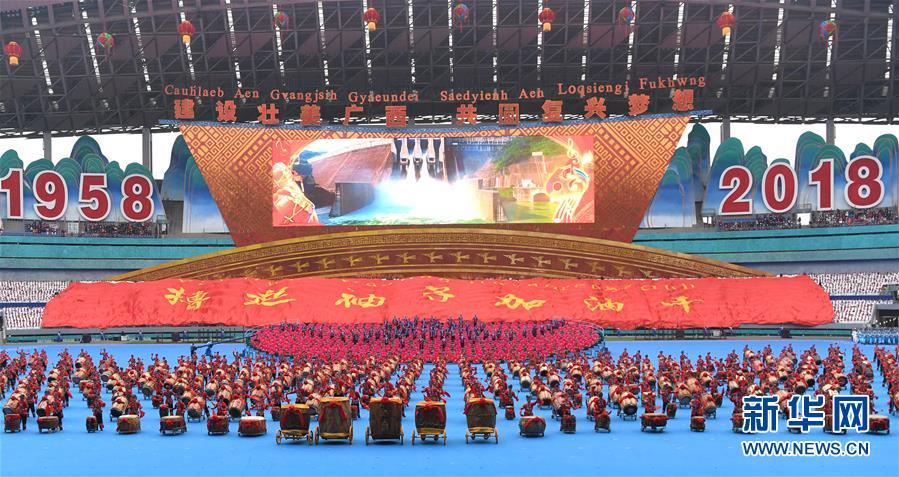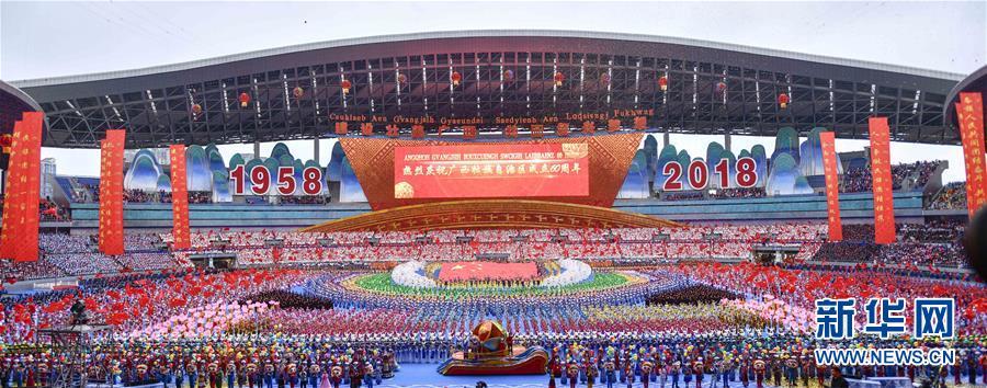12月10日,廣西壯族自治區(qū)成立60周年慶祝大會在廣西體育中心隆重舉行。這是慶祝大會上的群眾文藝表演。 新華社記者 申宏 攝