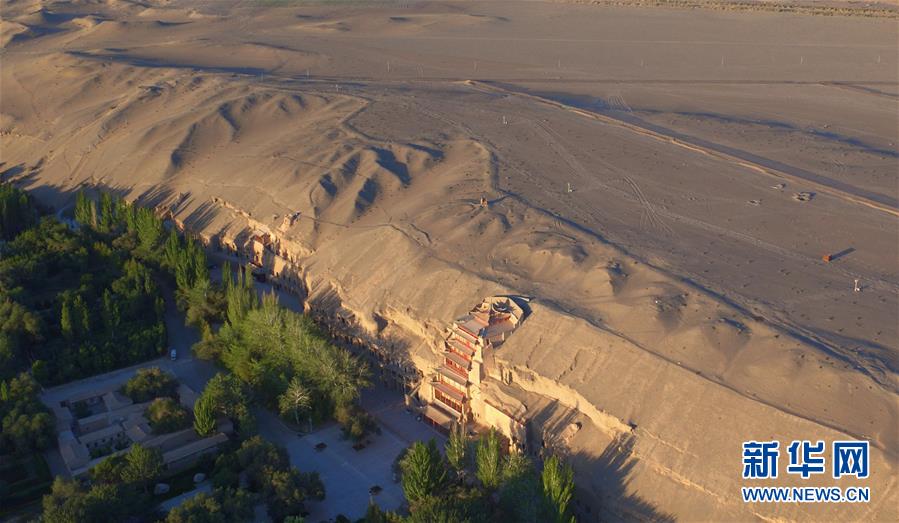 這是世界文化遺產(chǎn)莫高窟(2016年9月7日無人機(jī)拍攝)。 敦煌記錄歷史。開放的胸襟,曾讓這里成為古代絲綢之路上“華戎所交一都會”。 時隔千年,改革開放的春風(fēng)吹入西北內(nèi)陸小城,敦煌再度成為中國對外開放的文化前沿。 新華社記者 陳斌 攝