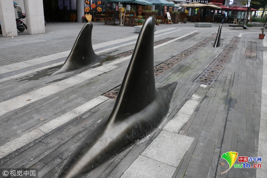 2018年11月20日,重慶一園區(qū)內(nèi)馬路中間突出一排“鯊魚鰭”,司機路人都被“嚇懵”了。突出的鯊魚鰭將兩側(cè)的車行道分開,原來,這是為了進一步保證車流的有序進出和行人過街安全,同時也為了防止亂停車占用人行道,設(shè)置了這種異形“隔離樁”。圖片來源:視覺中國