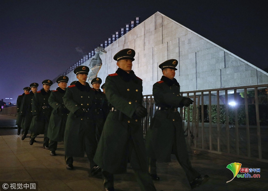 2018年12月12日晚,江蘇南京,侵華日軍南京大屠殺遇難同胞紀(jì)念館沿線道路莊嚴(yán)肅穆、安保和工作人員做好了準(zhǔn)備,迎接第五個(gè)南京大屠殺死難者國(guó)家公祭日。2018年是南京大屠殺慘案發(fā)生81周年,第五個(gè)南京大屠殺死難者國(guó)家公祭儀式將于12月13日舉行。圖片作者:尼克