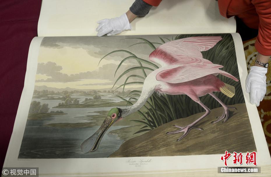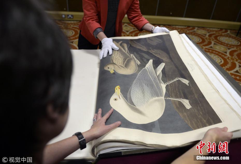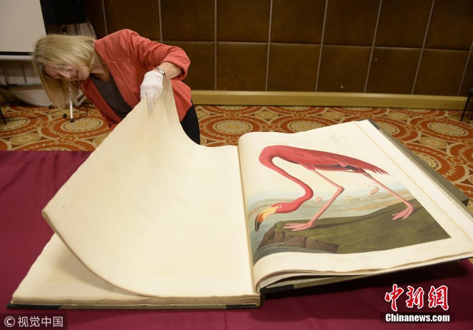 2018年12月12日消息,英國(guó)格拉斯哥,世界上最貴的印刷書——美國(guó)鳥(niǎo)類學(xué)家、畫家和博物學(xué)家詹姆斯·奧杜邦手繪的第一版《美國(guó)鳥(niǎo)類》被罕見(jiàn)取出米切爾圖書館保險(xiǎn)庫(kù)公開(kāi)亮相。圖片來(lái)源:視覺(jué)中國(guó)