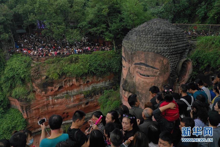 10月4日,游客在樂山大佛前排隊一睹大佛真容(無人機拍攝)?!⌒氯A社記者 江宏景 攝